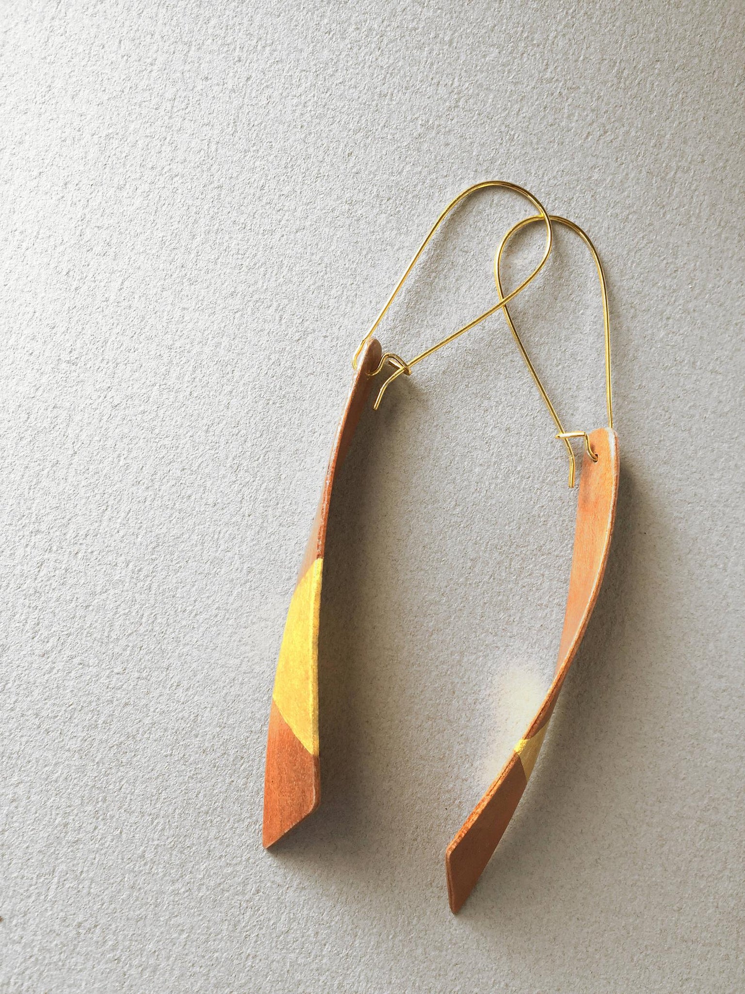 Large minimalist dangle earrings handmade from red Cherry wood and gilded with 24k gold in a geometric / distressed design on both front and back sides. This elegant, eco-chic earring is a tapered form bent into a spiraling twist. Hypoallergenic hooks. Length: 3 Inches. Width: 1/2 Inches. Material: Gold, Wood.