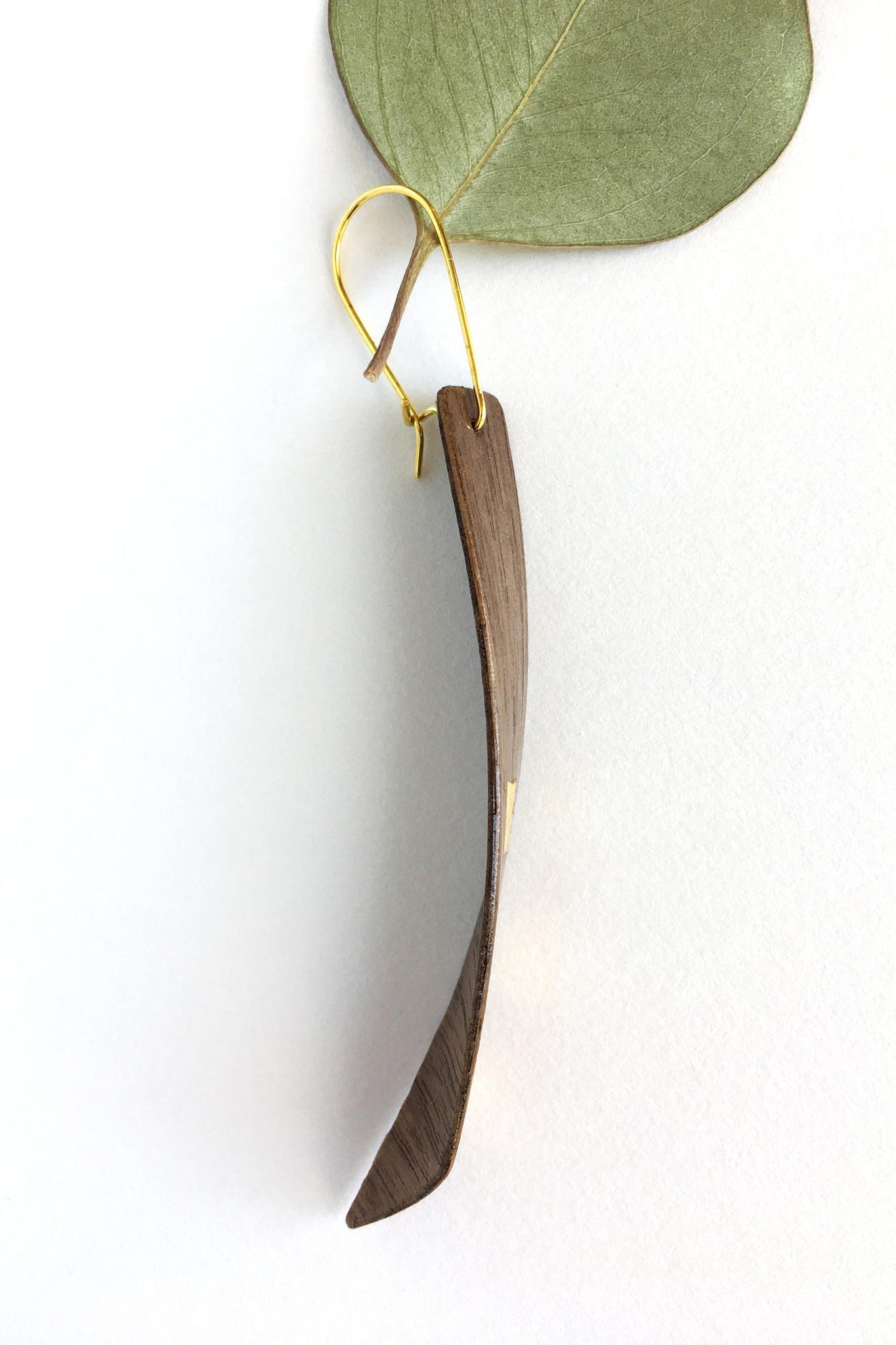 Long minimalist, geometric earrings handmade from twisted reclaimed black Walnut wood and gilded with tiny pure 24K gold leaf squares. This elegant, eco-chic earring is a tapered form steam-bent into a spiral twist. Material: Gold, Wood Recycled: Yes Length: 3 Inches Drop length: 3.5 Inches Width: .5 Inches Style: Boho & hippie Closure: Latch back