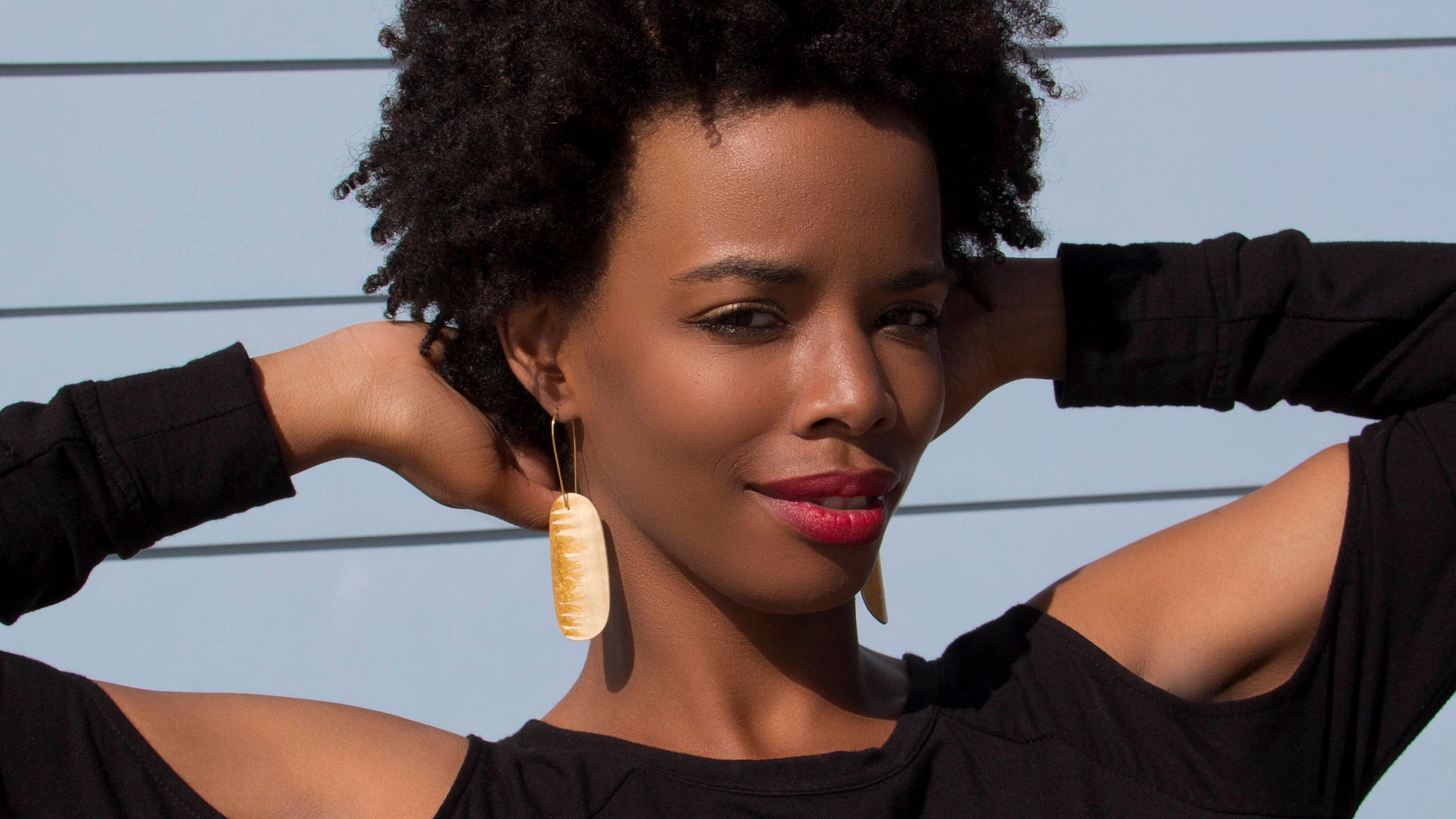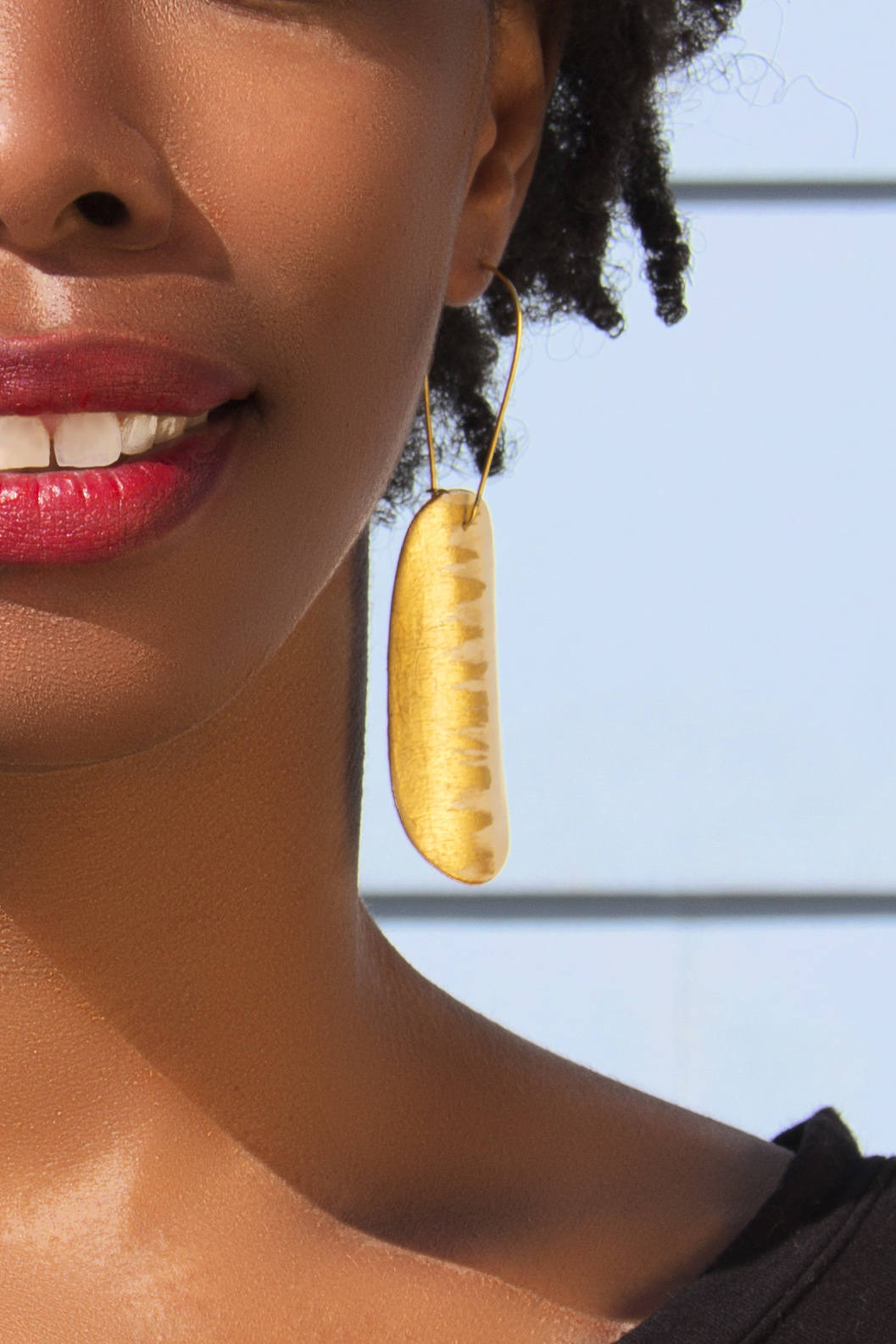 Large upcycled boho dangle earrings handmade from European sycamore wood and gilded with 24k gold leaf in a distressed, brushstroke design . This minimalist, simple statement earring is a little rectangle, a little oval, a little teardrop and has curved-back edges. Hypoallergenic nickel free hooks with latch back. Length: 1 1/2 Inches. Width: 3/4 Inches. Drop length: 3 Inches. Material: Gold, Wood.
